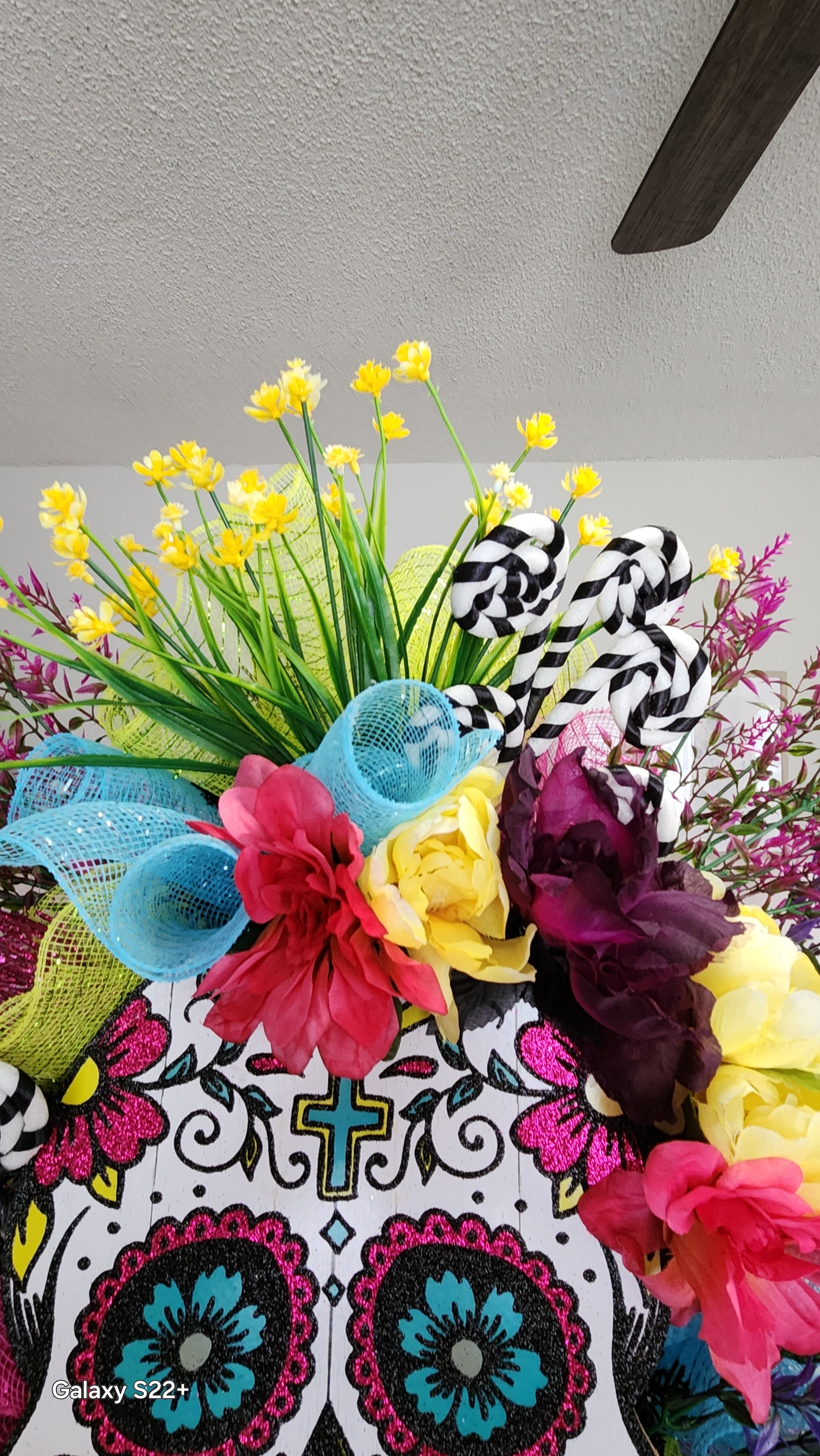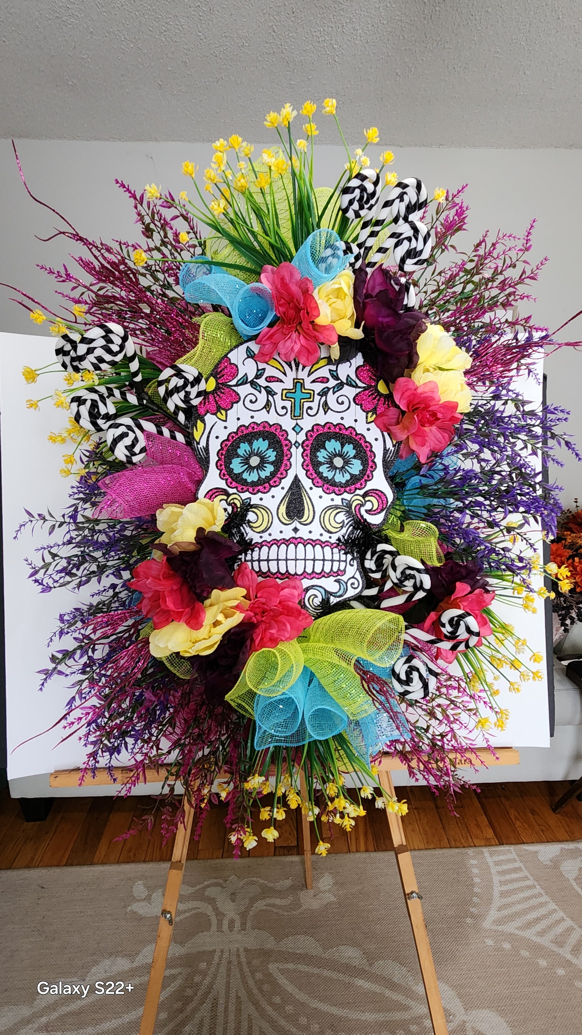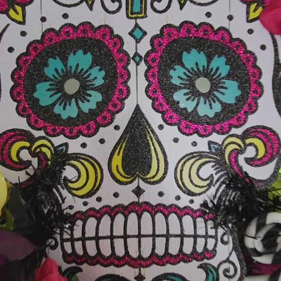 Brighten up your space with our Day of the Dead swag, featuring a vibrant sugar skull design and dazzling glitter accents. At 31 inches long by 25inches wide, this swag is perfect for adding a pop of color to your door or to any room. With bright florals and deco mesh on an evergreen base, it's a must-have for a festive occasion.
