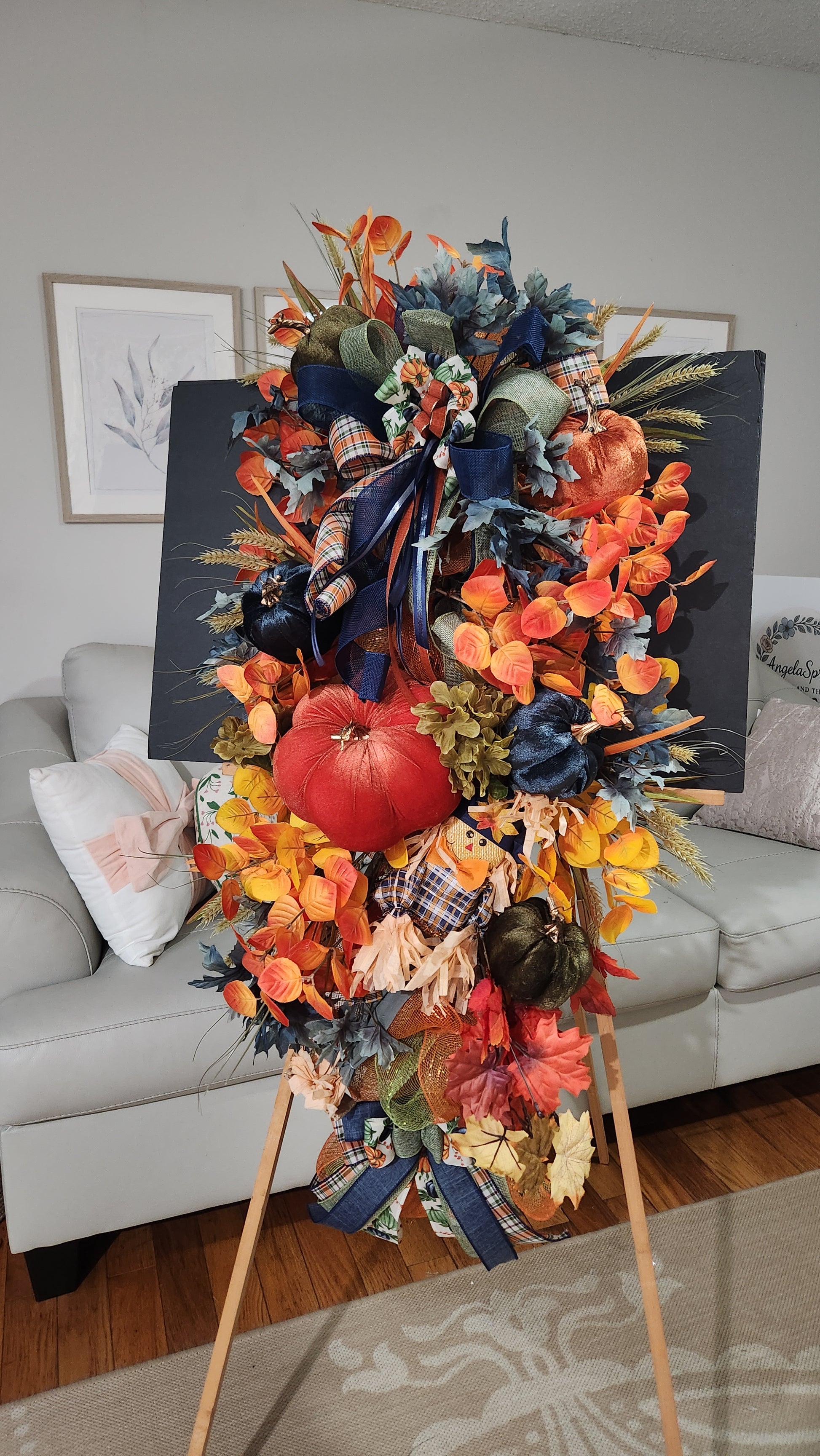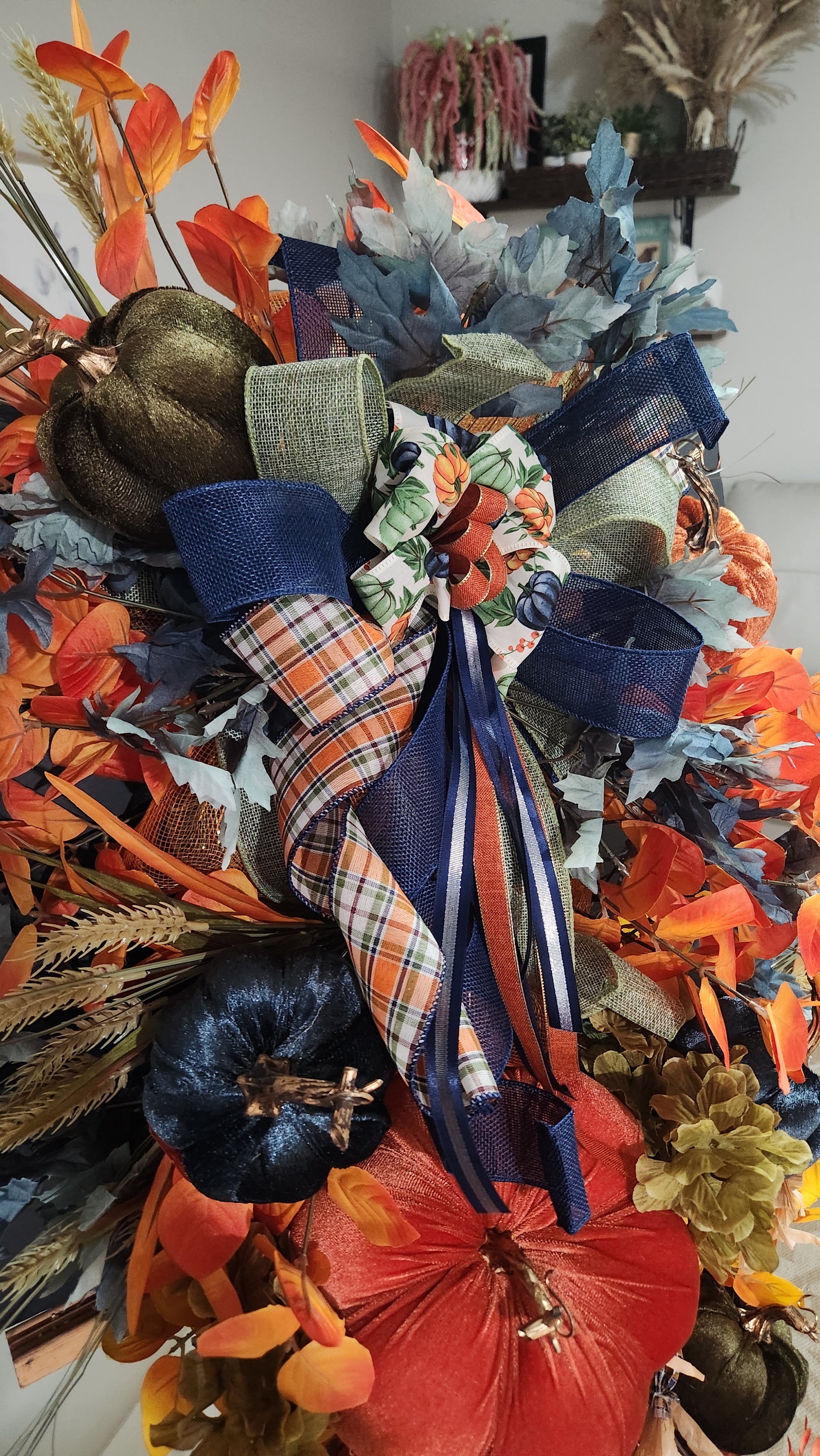 Raise the bar with our Glam Autumn Swag! This huge swag boasts luxurious bronze and navy colors, vibrant oranges and yellows, and a mix of forest greens and blues. Adorned with velvet pumpkins, florals, and ribbons, this 49in x 25in x 10in swag adds a touch of boldness and adventure to any door.