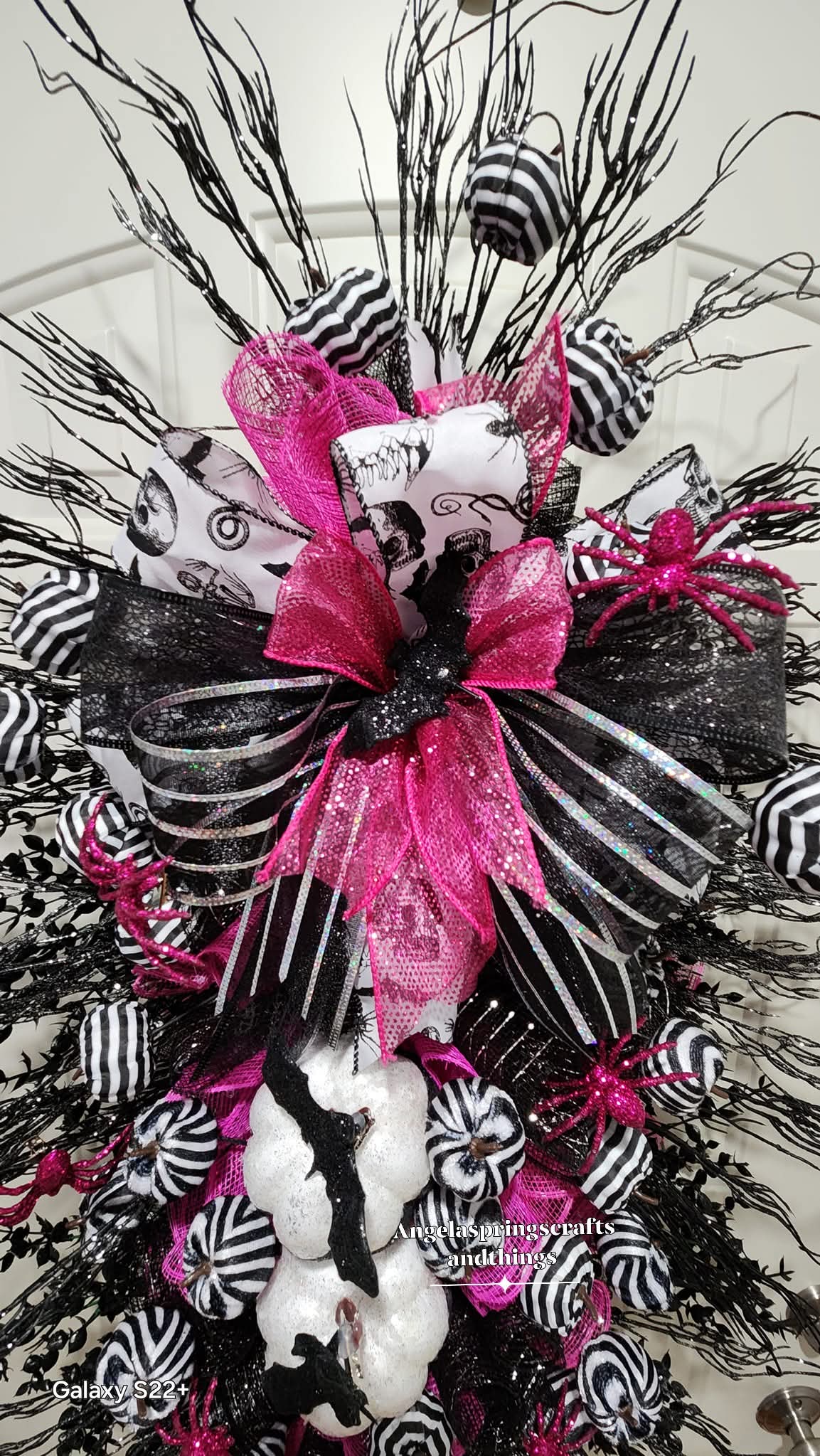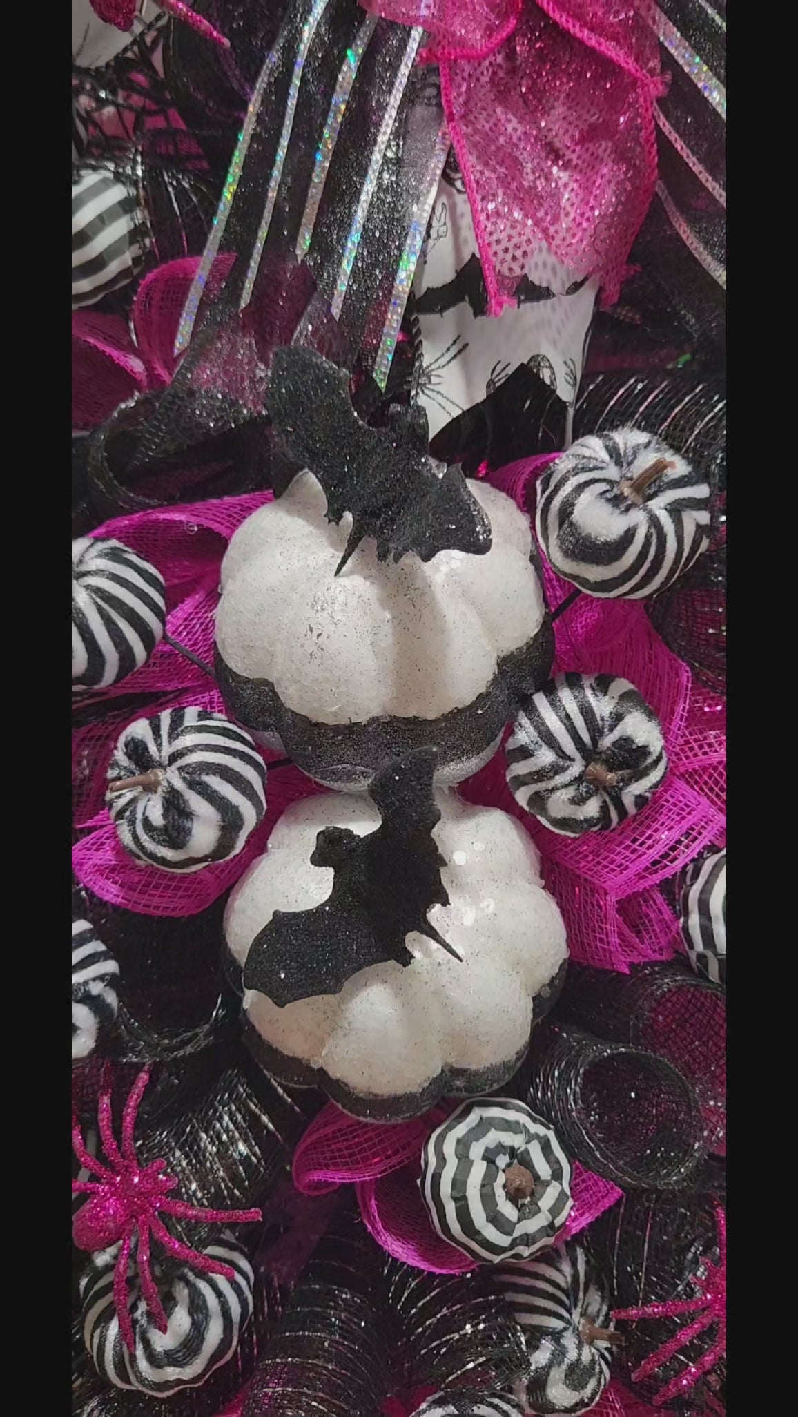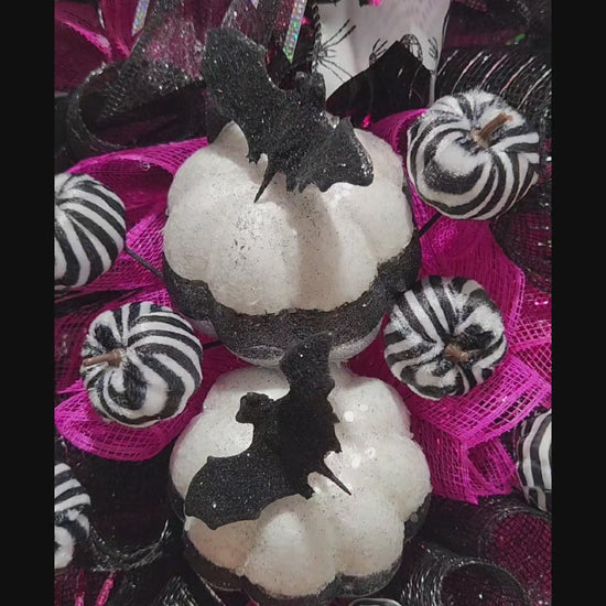 Get ready to make a statement this Halloween with our Glammy Goth Glittery Swag! Measuring at 36in x 18in x 8in, this large swag is a bold combination of hot pink, black, and white pumpkins, bats, and spiders, complete with halloween ribbon and black faux and glitter floral picks. Show off your daring decorating style and make your home stand out with this elegant and spooky swag. Mackensie child's meets Beetlejuice meets glitter halloween - an unbeatable combination for a truly unique and eye-catching display!Mackensie child's meets Beetlejuice meets glittery goth door swagThis large glam spooky swag is perfect for adding a touch of Halloween to your home decor. Measuring at 36in x 18in x 8in, it features a combination of hot pink, black, and white pumpkins, bats, and spiders, along with halloween ribbon and black faux and glitter floral picks. Make your home stand out this Halloween with this elegant and spooky swag.