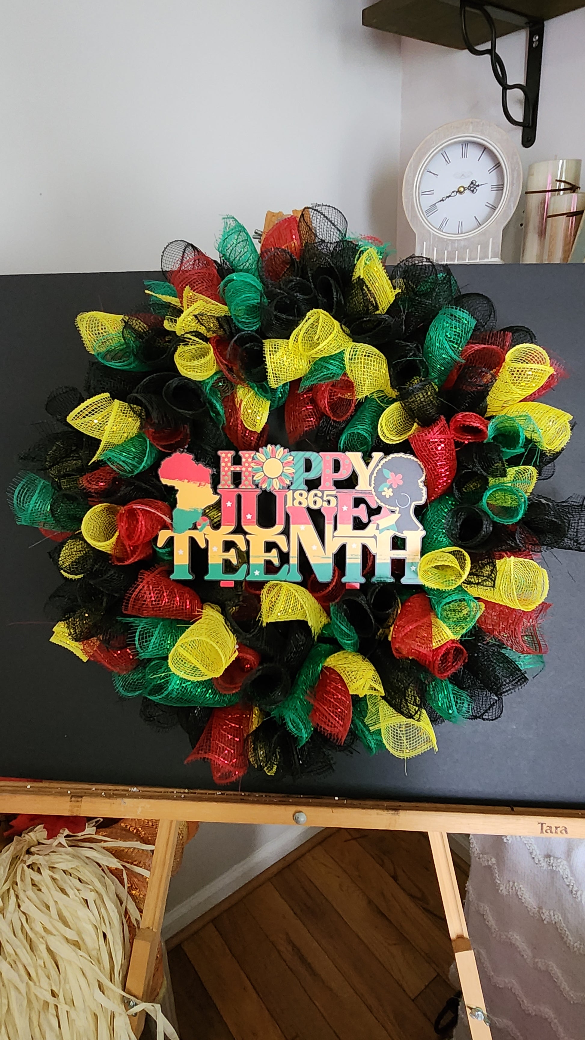 Celebrate Juneteenth with this 14-inch deco mesh wreath. Made with vibrant colors and bold patterns, this wreath is the perfect way to adorn your front door or wall. Showcasing your pride and support for this important holiday .