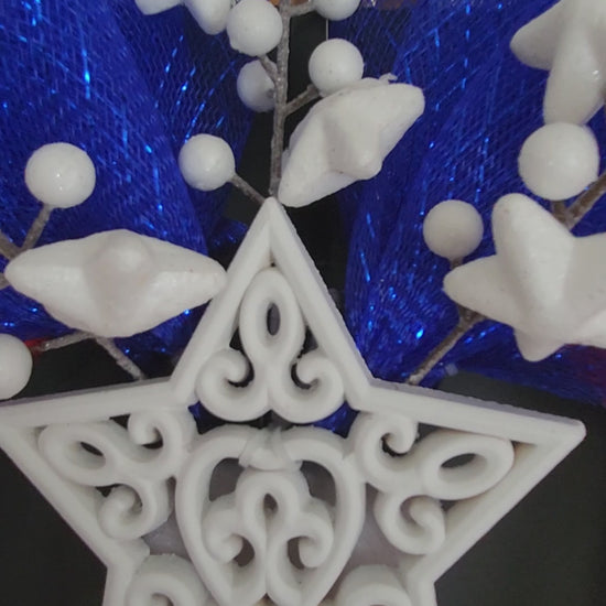 Display your patriotism with our Patriotic Angel Wings. This beautiful Deco Mesh wreath, measuring 28 inches by 24 inches, can be proudly displayed at your home or used to honor loved ones at graves or memorial sites. Customizations available upon request. Colors , materials, attachments all optional.