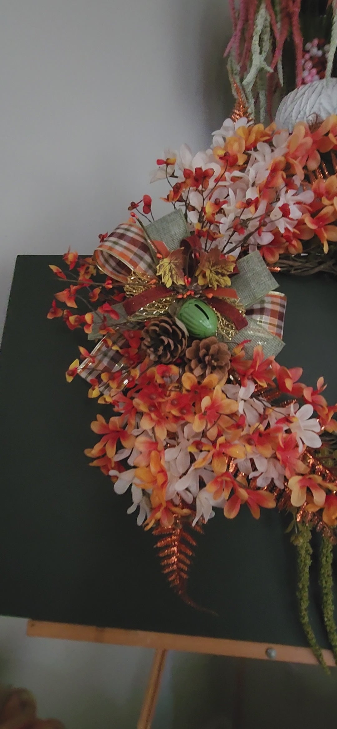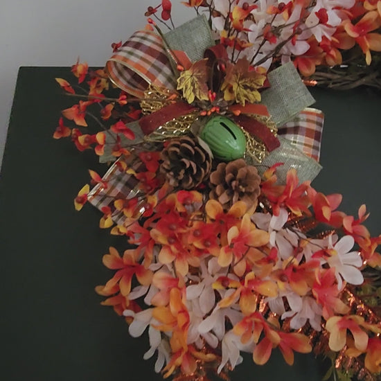Upgrade your fall décor with our Soft Autumn wreath. Measuring 14 inches, this grapevine wreath features a glitter fern in rust color, accented by burgundy, sage green, and orange plaid ribbons. Adorned with burlap, green, and brilliant orange flowers, as well as soft white flowers and cascading greenery, this wreath will bring warmth and charm to any space.